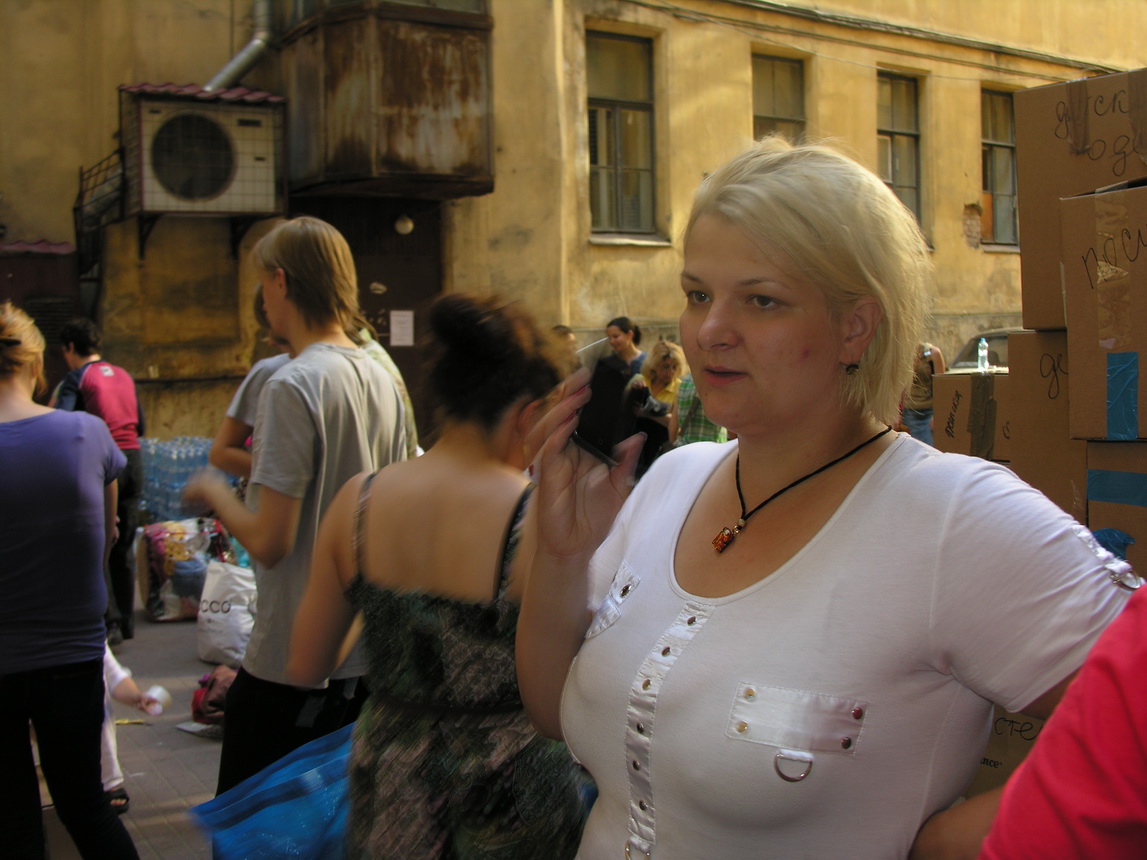 Александра Крыленкова, 10 июля 2012 во дворе дома на Литейном проспекте, 31, где организован сбор помощи пострадавшим от наводнения в Крымске.