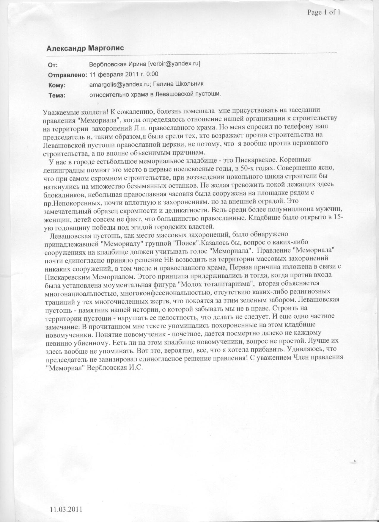 Письмо Ирины Савельвены Вербловской от 11 февраля 2011.