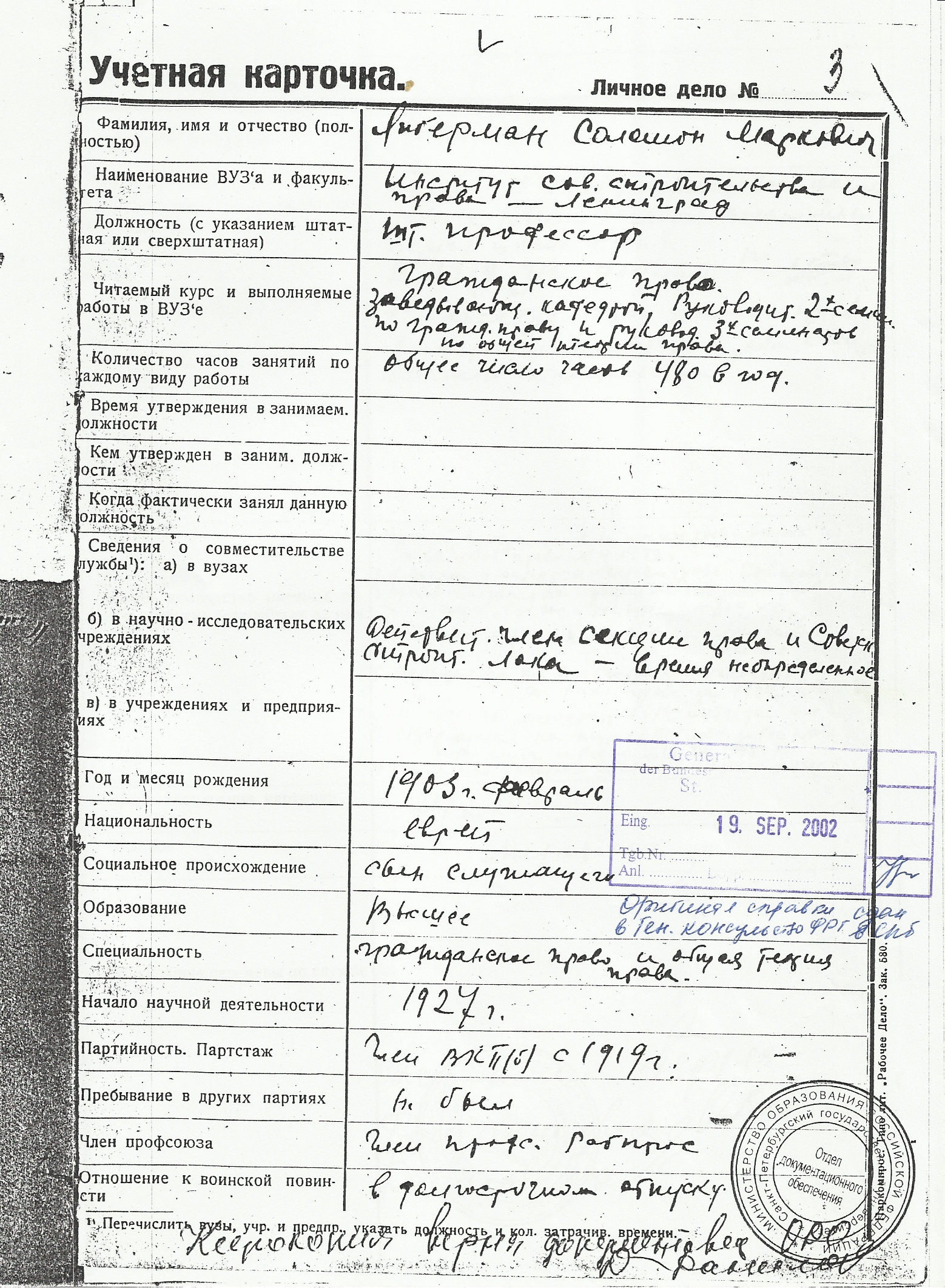 К мемуарам И.С.Либерман. 1-я страница учётной карточки С.М.Либермана.