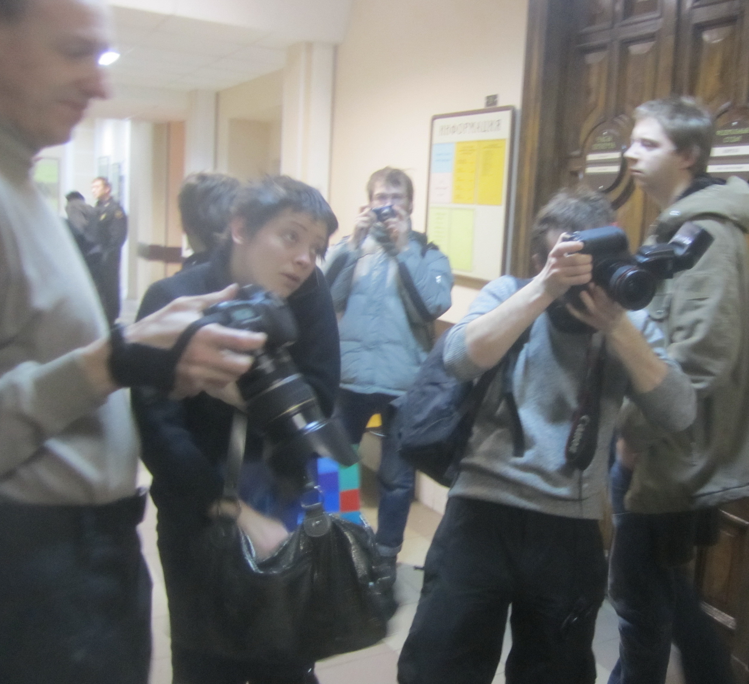 Репортеры фотографируют Наталью Козленок и Каспера. Процесс Олега Воротникова (арт-группа "Война"). 21 февраля 2011, Дзержинский суд Петербурга. Фото Владимира Костюшева.