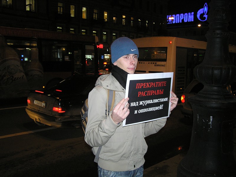 Фото Владимира Волохонского. 6 ноября 2010. Одиночный пикет на Невском проспекте в поддержку Олега Кашина, журналиста газеты "Коммерсантъ", в ночь на 6 ноября 2010 жестоко избитого в Москве во дворе дома, где он снимал квартиру.