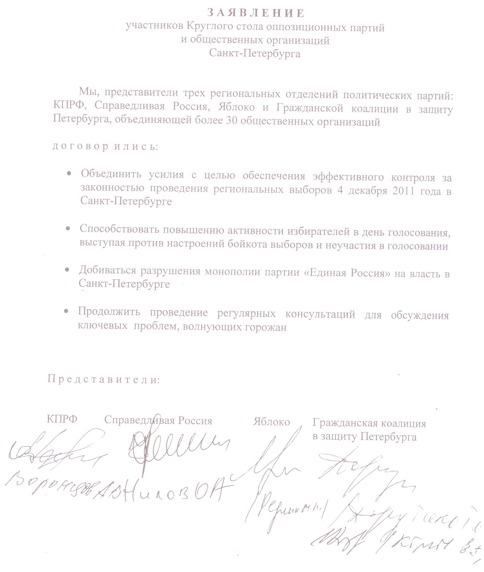 Зявление КПРФ, СР, Яблока и других от 2 авугста 2011