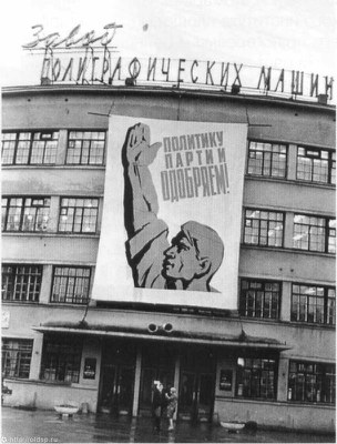 На снимке: Плакат над главной проходной завода «Ленполиграфмаш».