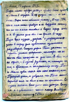 Вчера нашел первую зеленую травку. Отнес пучок ее Маме в подарок. И сегодня на … (нрзб. – А. А.) на окне. Вчера писал небольшой рассказ «В саду». То, что я там писал правда а не выдумка потому что то что я там описывал я видел перед собой и я самом деле был в то время в саду. Вчера был издан «декрет» о запрещении ходить в огород для избежания излишних разговоров. (Имеется в виду огород при доме, где наша семья в эвакуации в Омске снимала комнату). – А. А.).