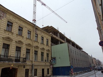 Со стороны Конногвардейского проспекта все пока выглядит более пристойно — но и тут запланированы дополнительные этажи. Арматура уже торчит над сохранившимся историческим фасадом. В настоящее время на этой территории, которая находится фактически в самом сердце исторического центра, действует самый строгий охранный режим — ОЗ 1. Здесь разрешено только воссоздание утраченных ранее исторических зданий. Снесенный дом причта Исаакиевского собора был трехэтажным и отлично вписывался в застройку Галерной улицы. Нарушения закона очевидны.