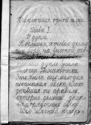 Кажется, первым из них было: «Приключения одной белки», - написанное в 8-летнем возрасте. В условиях военного времени (семья тогда жила в эвакуации, в г. Омске) школьные тетради были дефицитом. Мать сшила тетрадь из оберточной бумаги и разлиновала ее так, чтобы писать крупными буквами, с ограничением низа и верха строки, как в детских прописях.