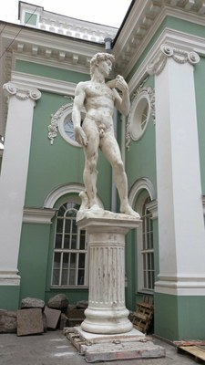 Организаторы выставки предложили придумать одежду для Давида, которая прикроет его наготу. Предложения принимают до 15 августа на почту promo@volkovpro.ru (с пометкой «Одень Давида»). Потом начнётся открытое голосование за лучший вариант. К 1 сентября для статуи сошьют одежду. Авторы 15 вариантов из короткого списка получат бесплатные билеты на выставку, автор победившего варианта — билеты на выставку для себя и друзей. ** См. также: Ну и ню! Голого «Давида» в Петербурге оденут («Комсомольская правда в СПб») ** Из официального сайта Уполномоченного по правам ребенка в СПб: КАРТИНЫ, СКУЛЬПТУРЫ И ДРУГИЕ НРАВСТВЕННЫЕ ОПАСНОСТИ ПЕТЕРБУРГА …Еще одно культурное событие коснулось сразу нескольких деликатных аспектов: дети, религия и просвещение. В середине мая во дворе лютеранской церкви святой Анны на Кирочной улице установили копию статуи Давида Микеланджело. 200-килограммовая скульптура, выполненная из пластика в натуральную 5-метровую величину, расположилась в пешей близости от Президентского лицея № 239. Не заметить шедевр довольно сложно, вот только далеко не всем это зрелище доставляет эстетическое удовольствие: «Как можно было поставить этого мужика без порток в центре Петербурга, возле школы и церкви? - недоумевает местная жительница Инна Львовна*. – Этот гигант портит исторический вид города и уродует детские души!». В личной беседе со специалистами Аппарата Уполномоченного Инна Львовна подбирала не менее сочные эпитеты для описания Давида и тех эмоций, которые он в ней будоражил. Доводы про Атлантов на Миллионной улице, про Летний сад и Петродворец, где статуи тоже не могут похвастаться платьями и штанами, не возымели никакого эффекта: они стоят давно, с ними народ уже свыкся, а этот новодел только мозолит глаза честным людям… Судя по информации организаторов, у церкви претензий к средневековому искусству нет - папская канцелярия одобрила проведение акции в Петербурге. Лояльность Ватикана Инну Львовну не впечатлила, но сместила аргументацию в сторону защиты детской нравственности: «Школа рядом, дети ходят, смотрят на гигантского голого мужчину. Разве это нормально??». Однако администрация самого образовательного учреждения отреагировала на появление нового «соседа» весьма спокойно. По словам директора лицея Максима Пратусевича, его ученики достаточно культурны и образованы, чтобы не пугаться и не высмеивать копию мирового шедевра. Жалоб от родителей и педагогов тоже не поступало. Увы, Инну Львовну эти слова не успокоили: женщина намерена писать во все профильные инстанции региона и страны, чтобы добиться «скорейшего устранения гиганта». Особенно после того, как СМИ заговорили о возможности «прописать» Давида в Петербурге навсегда… ** …При всем разнообразии информационных ресурсов и подходов, общую тональность описаний этой ситуации можно определить как если не оправдывающуюся, то вяло обороняющуюся. А некоторые – так даже (то ли в шутку, то ли всерьез) и предрешают итоги «народного волеизъявления»: «В Петербурге решили одеть копию статуи Давида». Впрочем, чем Инна Львовна отличается от депутата Госдумы РФ от партии ЛДПР Романа Худякова, который потребовал «убрать голого Апполона (на фронтоне Большого театра) со сторублевой банкноты»? Еще было бы интересно специально запросить насчет творения Микель-Анджело авторитет