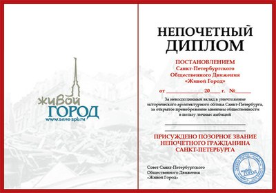 О звании «Непочетный гражданин Санкт-Петербурга»В последнее время среди чиновников городского правительства все отчетливее прослеживается склонность к выставлению только хороших оценок — как себе, так и тем, кто наиболее активно проявляет себя на ниве созидания новой, «современной» петербугской культуры. При этом пагубные стороны кипучей деятельности последних либо предусмотрительно замалчиваются, либо представляются как несомненное благо для города и его жителей. Благодаря такой линии поведения чиновников может возникнуть иллюзия, что ежедневно наблюдаемое нами грубое вмешательство в историческую архитектурную среду Петербурга продиктовано исключительно заботой о нашем уникальном городе и его культуре, а не тривиальной погоней за сиюминутной выгодой. Активисты движения «Живой Город» делают попытку прервать порочную практику «хороших оценок» и в очередной раз привлечь внимание общественности именно к пагубной деятельности отдельных персон. С этой целью движением учереждено новое звание - «Непочетный гражданин Санкт-Петербурга». Этот нелестный титул являет собой негативное отражение официально узаконенного звания «Почетный гражданин Санкт-Петербурга», которое уже в течение многих лет ежегодно присваивается людям, внесшим значительный вклад в развитие Санкт-Петербурга. Звание «Непочетный гражданин Санкт-Петербурга» предназначается тем персоналиям, чьи действия и решения нанесли ощутимый урон культуре и историческому облику города. Присвоение этого звания - хорошая возможность для горожан публично выразить свой протест против разрушительной градостроительной политики, реализуемой конкретными лицами при молчаливом одобрении городских властей. Перечень номинантов на звание «Непочетный гражданин Санкт-Петербурга», равно как и окончательные победители в «борьбе» за него, определяются самими жителями Петербурга посредством опросов и рейтинговых голосований, организуемых сообществом «Живой Город». Звание «Непочетный гражданин Санкт-Петербурга» вместе с сопутствующей ему атрибутикой — знаком непочетного гражданина и непочетным дипломом, — присваивается «Живым Городом» ежегодно в день основания Санкт-Петербурга. Акция по присвоению звания «Непочетный гражданин Санкт-Петербурга» не носит политической окраски. Поэтому данного высокого звания не могут быть удостоены политики за свою профессиональную деятельность.