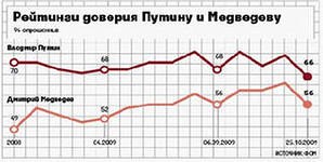 Соответственно, измеряется также рейтинг доверия к Д.А. Медведеву, а также рейтинги доверия к каждой из парламентских партий. («Единая Россия» и проч.). Но мы сейчас не будем их обсуждать, а сосредоточимся на двух указанных видах рейтинга В.В. Путина.