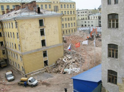 Начался демонтаж дома служащих Государственного банка (Загородный, 19), стоящего на внутриквартальной территории за домом 12 по пер.Джамбула. К настоящему времени снесена половина здания. Разрешение на работы у застройщика, компании «Ховард», имеется.