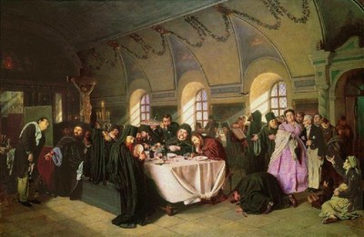 Думаю, многие еще помнят картину Василия Перова "Монастырская трапеза", писанную во времена Салтыкова-Щедрина и в том же в сатирически-карикатурном ключе. Она пародирует классическую тему тайной вечери и явно лишними выглядят на сем пиру два мученика: распятый Христос и нищенка, просящая милостыню.