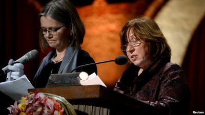 Нобелевский лауреат назвала своими учителями белорусских писателей Алеся Адамовича и Василя Быкова, и рассказала, как её украинская бабушка в детстве читала ей «Кобзаря» Тараса Шевченко наизусть.