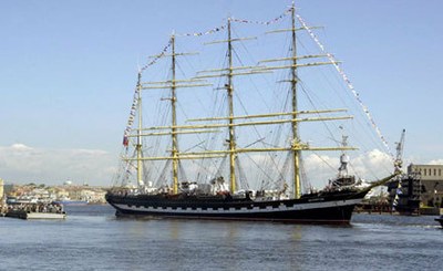 САНКТ-ПЕТЕРБУРГ, 17 мая. /Корр. ИТАР-ТАСС Иван Скиртач/. Учебный барк "Крузенштерн" сегодня в полдень ошвартовался на набережной Лейтенанта Шмидта в центре Петербурга. Легендарный парусник прибыл в город для участия в параде военных кораблей, посвященном 310-летию со дня основания Балтийского флота, который состоится в субботу, 18 мая, в колыбели российского флота Кронштадте. <…>