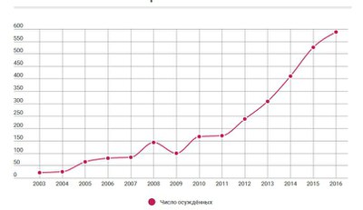 Статистика Судебного департамента при Верховном суде России убедительно демонстрирует катастрофический рост числа политических дел, по которым вынесены обвинительные приговоры. За 13 лет число приговоров выросло ровно в 28 раз: в 2003 году вынесен 21 приговор, в 2016-м — 588.