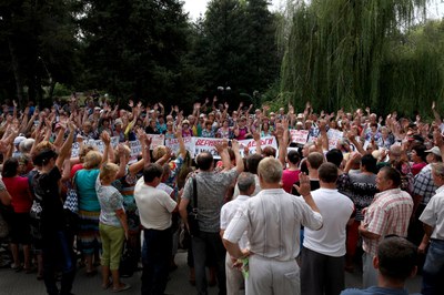 На следующий день шахтеры приняли решение отклонить предложение губернатора. Подняли руки. Круг стоял совсем плотно, люди дышали друг другу в шеи. «Пикет продолжаем?» — «Да!» — «Голодовку продолжаем?» — «Да!» Казалось, люди ликуют. «Мы им не верим, не верим, мне год оставался до пенсии, я жизнь сломала», — кричала Оля с Алмазной. Подруги удерживали ее. Многие плакали.