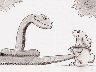 – Уф, – вздохнул удав, – так устал, как будто не я душил, а меня душили... Неудивительно – первая в мире обработка кролика без гипноза... С таким гениальным открытием меня Великий Питон примет с распростертыми объятиями... Хотя теперь это может звучать и двусмысленно... Сейчас подкреплюсь – и к своим... Еще видно будет, кто достойнее быть царем удавов...