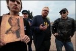 Некоторые держали в руках транспаранты и лозунги. «Защитим детей от педерастии!» — такой плакат пытался закрепить на дереве молодой человек. Почти сразу он был задержан полицией за нарушения правил благоустройства города, после чего православные затянули молитвенные песнопения.