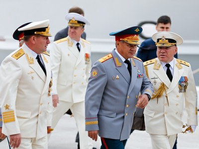 Фото: Россия. Калининградская область. 26 июля 2015. Главнокомандующий ВМФ России Виктор Чирков), министр обороны РФ Сергей Шойгу и командующий Балтийским флотом РФ Виктор Кравчук (слева направо на первом плане) в Балтийске. Виталий Невар, ТАСС