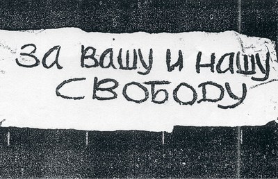 У Захаровой был плакат с лозунгом «За вашу и нашу свободу!» и цитатой из «Фауста» Гете: «Лишь тот достоин жизни и свободы, кто каждый день за них идет на бой».
