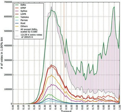 Таким образом, честных выборов опять не получилось. Схематично говоря, можно было представить себе два возможных сценария выборов — по варианту 2003 года, с относительно невысокими фальсификациями в ограниченном круге регионов, или по варианту 2011 года, с массовыми фальсификациями в большом числе регионов. В итоге реализовался второй сценарий, с тем разве что исключением, что не было массовых фальсификаций в Москве и Санкт-Петербурге. Но эта уступка была с лихвой скомпенсирована чрезвычайно низкой явкой в обеих столицах — 35% и 33% соответственно — так что столичные жители упустили хороший шанс если не изменить принципиально итоги голосования по федеральному списку (что едва ли было возможно), то хотя бы побороться за более подходящих депутатов в одномандатных округах. В остальном же список регионов, внесших вклад в накручивание голосов «ЕР», принципиально не изменился. Среди активно проявивших себя, помимо традиционных Башкортостана, Мордовии, Татарстана и ряда республик Северного Кавказа, — Белгородская, Воронежская, Кемеровская, Липецкая, Нижегородская, неожиданно сильно выступившая Пензенская, Ростовская, Рязанская, Самарская (где теперь губернатором бывший глава Мордовии Меркушкин), Саратовская области (последняя на этих выборах заслуживает отдельной статьи). Среди новичков можно поздравить с вступлением в ряды фальсификаторов ранее никогда не замеченную в них Ивановскую область. Сохранила репутацию цитадели честного подсчета голосов Свердловская область; кажется, встала на путь исправления Республика Коми, прославившаяся в свое время рисованием результатов в Сыктывкаре. Зная количество голосов, добавленных в пользу «ЕР», можно вычислить, какими были бы результаты голосования по федеральному округу, если бы этих голосов не было.