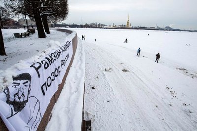 Сегодня, 24 января 2015, активисты молодёжного движения «Весна» на стрелке Васильевского острова развернули баннер с надписью «Рамзан Кадыров – позор России» и карикатурой, изображающей главу Чеченской Республики в смирительной рубашке.