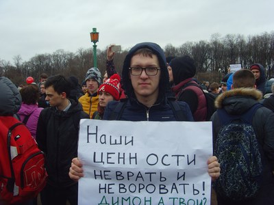 26 марта на Марсовом поле в Санкт-Петербурге состоялся массовый антикоррупционный сход граждан. Митинг сторонников Навального на эту тему разрешен не был. Как разъяснила Полина Костылева, координатор волонтеров штаба А. Навального в Санкт-Петербурге, в отказе было сообщено, что в это время на Марсовом поле будет проводиться мероприятие, посвященное семейным ценностям. Когда мы пришли туда, то увидели флаги НОД, так называемого национально-освободительного движения – проправительственной организации, готовой к провокациям и силовым действиям против демократов. НОД с артистами развлекало примерно сотню своих сторонников песнями советского времени.