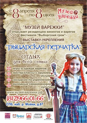 Внести свой вклад в доброе дело, познакомить себя и своих детей со средневековой культурой, "потрогать" рыцарский фестиваль "Выборгский гром" своими руками можно уже с 8 апреля в шаговой доступности от м. "Адмиралтейская" на наб. р. Мойки, 87 в "Музее варежки".