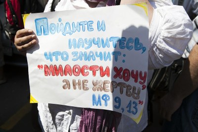 Плешивый дяденька воздевал руки к небу и кричал что-то вроде: «С нами Бог!», а стоявший рядом с ним человек сжигал портреты трех участниц Pussy Riot. В этот момент тот самый, что вытягивал руки, вдруг закричал, что есть силы: «Патриарх Кирилл наш лидер, эй, эй!». Но это, все-таки, было ошибкой, так как его оппоненты включились в процесс и получалось что-то неприличное, вроде «Патриарх Кирилл – гей!».
