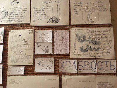 В фойе театра была развернута небольшая выставка тюремных рисунков и писем фигурантов дела «Сети».