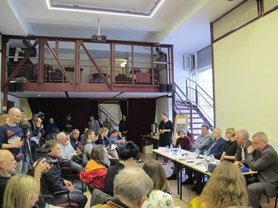 Брифинг состоялся в помещении Международного общества «Мемориал» в Москве (Каретный Ряд, 5/10). В нём приняли участие: Николай Сванидзе (Москва) – историк, журналист, член постоянной комиссии по исторической памяти СПЧ при Президенте РФ; Сергей Кривенко (Москва) – член Правления Международного Мемориала, член постоянной комиссии по исторической памяти СПЧ при Президенте РФ; Виктор Ануфриев (Москва) – адвокат Юрия Дмитриева; Анатолий Разумов (Санкт-Петербург) – руководитель центра «Возвращенные имена» при РНБ, член Петербургской комиссии по восстановлению прав реабилитированных жертв политических репрессий, составитель книги памяти «Ленинградский мартиролог»; Ольга Керзина (Москва) – директор Московской Международной киношколы; Екатерина Клодт (Петрозаводск) – дочь Юрия Дмитриева.