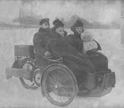 Фотография — огромная (примерно соответствует современному формату А-3), на картоне. Все сидят в трехколесном автомобиле, очень старинной конструкции (на современный взгляд — скорее самодвижущаяся коляска: без крыши, пассажиры спереди, а водитель — мой дед — сзади, за рулем), на фоне Путиловского завода (как рассказывала мне мать).