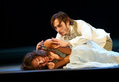 Камертоном такого толкования становится первый же диалог спектакля – между Кнуровым (Александр Солоненко) и Вожеватовым (Максим Мишкевич). Вожеватов, посреди рассудочно-размеренного, солидного разговора о том, что ему «из воспитания» несвойственно то, что люди называют любовью, вдруг сладострастно обнимет черные вертикали «занавеса», через которые виднеется на помосте силуэт Ларисы, выхваченный светом. Между словами и действием вдруг обнаружится пропасть, разделяющая размеренную купеческую фальшь и суетливую искренность небогатого чиновника Карандышева, которого мало заботит «красивый фасад», отягощенный соблюдением показных приличий.