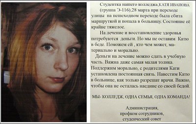 5 апреля с 11 до 14 часов на ул. Правды, 20 в Киновидеотехническом колледже пройдет акция помощи и поддержки студентки колледжа Кати Ивановой.