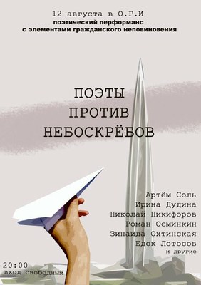 В четверг, 12 августа 2010, в 20.00 в Пир О.Г.И. на Фонтанке 40 состоится поэтический перформанс с элементами гражданского неповиновения ПОЭТЫ ПРОТИВ НЕБОСКРЁБОВ.