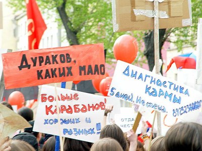 Не забывайте о транспарантах с абсурдными лозунгами. Каждый изготавливает себе сам.