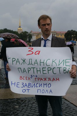30 июля 2016 в Петербурге состоялась несогласованная акция ЛГБТ-активистов. 14 человек стояли с одиночными пикетами под дождём на Дворцовой площади.