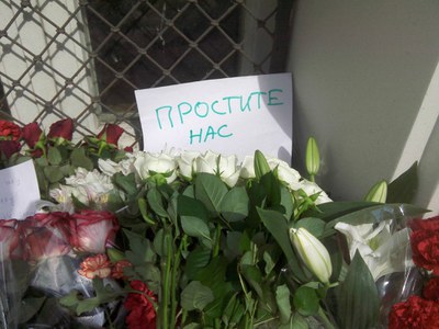 К посольству Королевства Нидерландов в Москве и к Генеральному консульству в Петербурге несут цветы и записки. На нескольких записках, как на фотографии, которая была сегодня опубликована в facebook.com, по-русски написано "Простите нас".