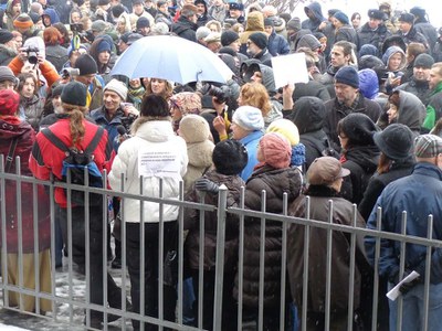 Неожиданно в центре толпы забурлил людской водоворот, журналисты пытались заснять происходящее, поднимая фотокамеры над головой, полицейские, окруженные плотной стеной участников схода и прессы, тащили кого-то к машинам. «Ура! Провокатора забрали!» - веселились те, кто вынырнул из водоворота. «Кого, кого забрали?» – переспрашивали остальные.
