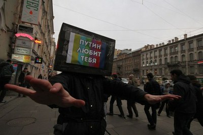 Во второй половине дня в понедельник, 24 марта 2014, люди с телевизорами вместо головы прошли от улицы Восстания до набережной реки Фонтанки. На их лицах-экранах транслировались основные мысли нынешней власти: «Война — это мир», «Запад нас боится», «Геи — не люди», «Путин любит тебя». Возглавляло колонну лицо российской пропаганды лицо Владимира Путина. В конце шествия люди восстали и сбросили свои ящики в лидера колонны.