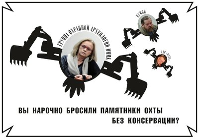 9 марта в одиночных пикетах с плакатом (см. на этой странице) напомнили о том, что работавшая в 2010 году на Охтинском мысу археологическая экспедиция ИИМК под руководством Н. Соловьевой, оставила обнаруженные там памятники незаконсервированными, что прямо противоречит правилам проведения раскопок. Из-за безответственности археологов брошенные на произвол судьбы памятники разрушаются под дождем и снегом.