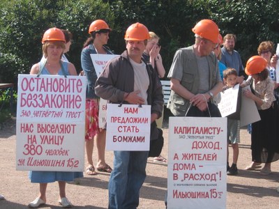 «Бездомные строители — позор властям!» — скандировали 18 июля жители дома, одетые в строительные каски. Порядка 400 жильцов дома, построенного для семей строителей, подлежат выселению без предоставления другого жилого помещения на формально законных основаниях: право собственности на квартиры, в которых проживают строители было зарегистрировано за частным предприятием, впоследствии перепродавшим квартиры другим организациям.