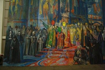 Наконец, сегодня были опубликованы результаты еще одной акции, состоявшейся в концк прошлой недели. В группе "ИСПРАВЛЯЙ! УГАРАЙ!" появились фотографии своеобразно "исправленных" изображений, висящих при входе в Манеж. Здесь проходила юбилейная выставка, посвященная 80-летию Санкт-Петербургского Союза художников. На входе висели репродукции фрагментов картин религиозной тематики. Активисты наклеили на лица священников на этой картине цветные маски в стиле Pussy Riot. Они провисели до утра. Однако были зафиксированы инициаторами акции и сегодня появились в социальных сетях.