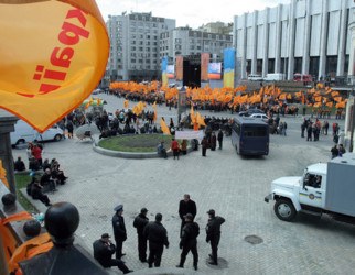 Сейчас молодые люди идут по Крещатику (десятитысячные толпы) с криками "Банду геть!". На Майдане Незалежности молодые люди оазбирают металлические конструкции, а сотрудники милиции "просто текают".