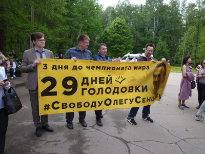 Четверо представителей «Открытой России» стояли с большим желтым баннером, напоминая о 29-м дне голодовки Олега Сенцова.