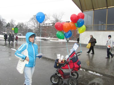 Мы планировали проехать по всем станциям метро нашего [Калининского] района. Но по техническим причинам (листовки закончились), вынуждены были ограничиться тремя. Люди реагировали очень позитивно, нас все хвалили (кроме матерей, которым мы не могли дать шарики детям).