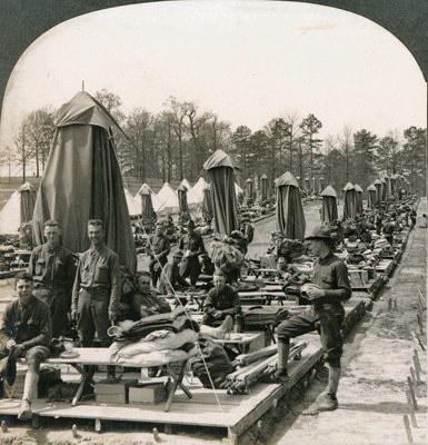 "6 апреля 1917 года США объявили о своем вступлении в Первую мировую войну против Германии. Впервые в истории США был принят закон о всеобщей воинской повинности. В стране была объявлена регистрация резервистов — совершеннолетних мужчин в возрасте до 45 лет. Однако далеко не все зарегистрировавшиеся отправлялись на службу, так как закон предусматривал жеребьевку. Из резервистов, которым выпало служить, составилась армия в 4,8 миллиона человек, однако в Европу отправили меньше половины,1 миллиона американцев (всего в войне участвовало 56 миллионов человек). Одновременно с формированием армии начались сборы денежных пожертвований на военные нужды.