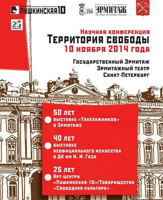 Утром 10 ноября 2014 (понедельник) в Государственном Эрмитаже откроется конференция «Территория свободы», посвященная юбилею арт-центра «Пушкинская-10» (25 лет), 50-летию выставки «Такелажников» в Эрмитаже и 40-летию выставки неофициального искусства в ДК им. И. И. Газа. Конференция проводится при поддержке Комитета по культуре Правительства Санкт-Петербурга.