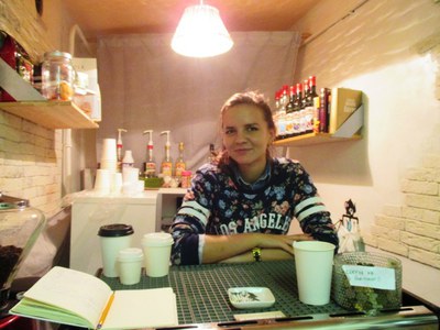 Алена приехала в Петербург из Омска, получив там университетское филологическое образование, а здесь она снова учится – уже заочно в РГПУ им. Герцена на факультете управления. Сначала в арке в крошечном помещении Алена открыла цветочную лавочку, но потом решила сделать кофейню. «Soul-business – бизнес для души, людям это дарит радость, у нас тут один стул, но он почти всегда занят, это для многих отдушина – прийти и поговорить, - говорит она. – Люди приходят, берут кофе, рассказывают истории, приносят книги – у нас буккроссинг есть». Вот зашел недавно почтальон и принес на счастье смешной сувенир – корову в банке. Посетители постарше обязательно вспомнят самые популярные кофейные места в Ленинграде и «маленький -двойной –без-сахара» в легендарном Сайгоне. «Как здорово, что посетители приходят и говорят мне: «Пожалуйста, как обычно!», я уже многих знаю и знаю, какой кофе или чай или горячий шоколад они любят», - говорит Алена.