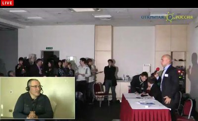 Самое интересное происходило внутри: свет горит, по зданию ходят какие-то люди (не полицейские). Лифт работает. Поднимаюсь на нужный этаж, прохожу в то крыло, где арендован зал. Там всё иначе: в коридоре темно, в вестибюле, где стоят столы для регистрации участников, - совсем темно, лежат незаполненные листы, и никто никого не регистрирует. Вхожу в зал. Огромный экран пуст. Голос Ходорковского слышу. Изображение тоже, наконец, нахожу: на ноутбуке на столе организаторов. В зале человек семьдесят, задние ряды свободны. Тусклый декабрьский свет пробивается сквозь окна, но разглядеть людей можно.