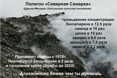 Мусорный полигон «Северная Самарка» расположен по адресу: Ленинградская область, Всеволожский район, деревня Самарка, участок № 1. Действует с середины 1970-х годов, и по новым правилам, он должен быть закрыт еще в 2000 году. Сегодня эта мусорная гора видна с северных окраин Петербурга. «Вокруг этой горы разлагающихся отходов — вода, болото. За болотами — садоводства, в которых «поправляют здоровье» наши сограждане. Само болото представляет собой исток ручья Безымянный, который впадает в приток реки Невы — речку Черную» — говорит Александр Карпов.